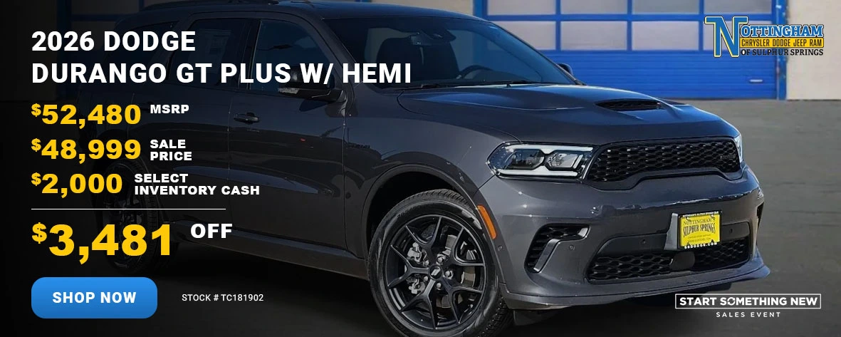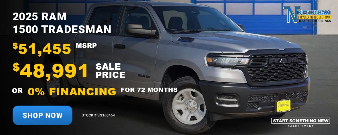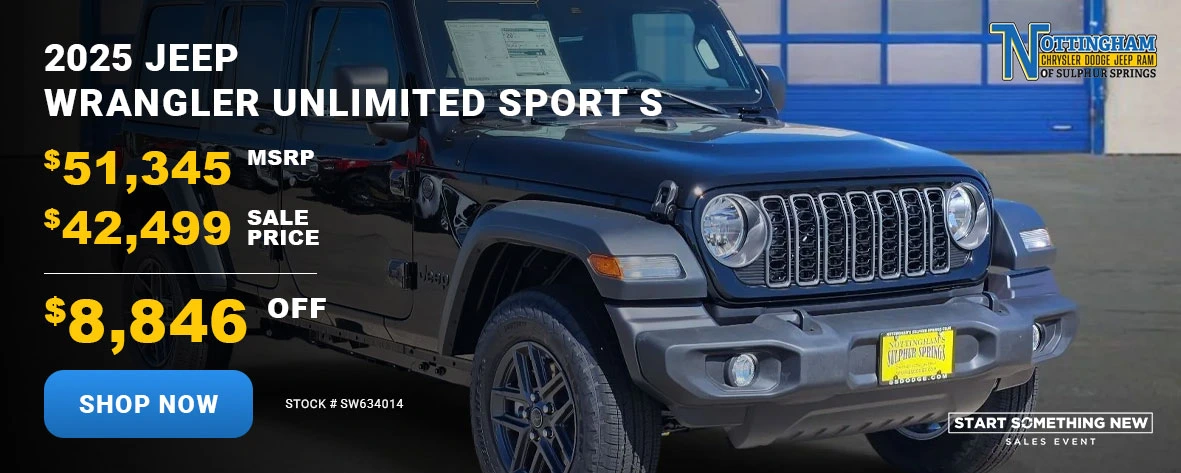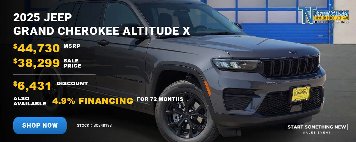 At Nottingham CDJR of Sulphur Springs, we’re more than just a dealership — we’re your hometown partner for all things automotive. From new and pre-owned vehicle sales to expert service and easy financing, our goal is to exceed your expectations at every step.